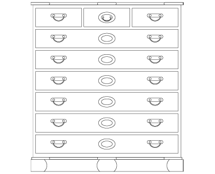 This seven-drawer chest was created for customers who desire more drawers than the five-drawer version. The main body can be separated into two parts for ease of transport in compact spaces such as staircases spaces. From the main body to the materials of the drawers, all wood components are made of paulownia wood with straight grain and low distortion called "Masa". Despite this chest being a two-piece design, it maintains a single continuous piece of wood from top to bottom, making it remarkably distinguished by its beautiful wood grain. The three small drawers and the six large drawers, as well as hidden compartments, can all be locked by key. In addition, hidden compartments are also included.